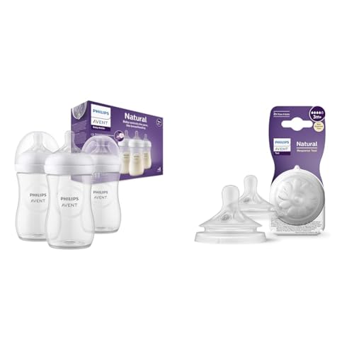 Philips Avent Lot de 3 biberons à Réponse Naturelle de 260 ml sans BPA, pour les bébés de 1 mois & Avent Lot de 2 tétines pour biberon à Réponse Naturelle 0% BPA, Débit 1