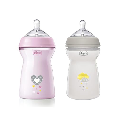 Chicco Biberon Anticolique Natural Feeling, 6 mois +, 330 ml, biberon avec tétine en silicone souple et flexible, adapté à l'allaitement mixte, débit rapide, rose et neutre, 2 pièces