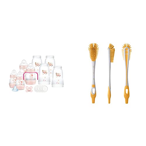 MAM Biberon Easy Start Lot de 8 biberons en formats de 130 ml, 160 ml et 260 ml, couleur rose, 730 g & Goupillon biberon & tétine, poils extra-souples anti-rayures – coloris aléatoire