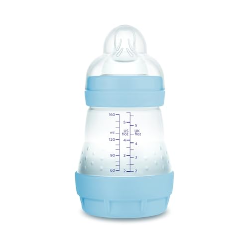 MAM Biberon anti-coliques, nouveau-né, 0-2 mois, 160 ml, avec tétine 1 flux lent en silicone, facile à accepter, auto-stérilisable et facile à nettoyer, Easy Start Anti-Colic, bleu mat, lot de 1 unité