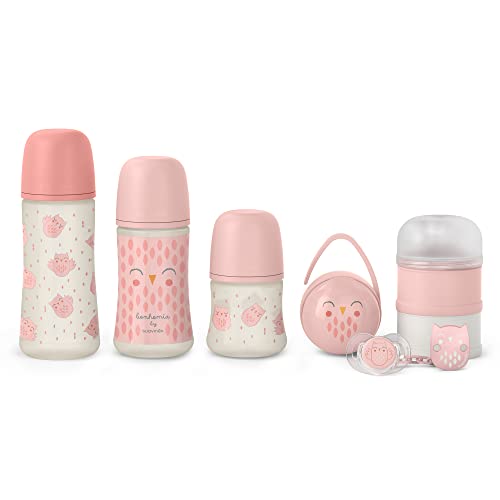 Suavinex, Cadeau Naissance Welcome Baby, pour Nouveau-né. Biberon 150 ml + 270 ml + 360 ml + Sucette Symétrique SX Pro 0-6 Mois + Doseur + Boîte à Tétines + Attache-Sucette. Rose