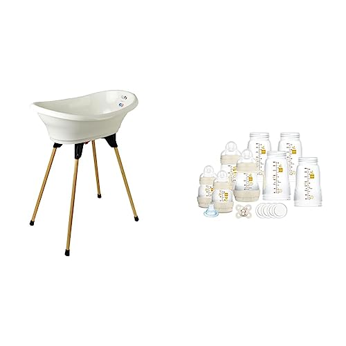 THERMOBABY - Kit Baignoire Bébé - Vasco - Baignoire & Tuyau De Vidange - Blanc Muguet & Mam Ensemble de 8 biberons, 1 tétine Start Nanò, 4 disquettes, 1 bec souple et poignées, couleur beige