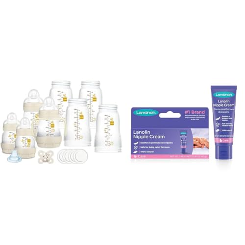 Mam Ensemble de 8 biberons de 130 ml, 160 ml et 260 ml, 1 tétine Start Nanò, 4 disquettes, 1 bec souple et poignées, couleur beige & Lansinoh I Crème Lanoline HPA 40 ml