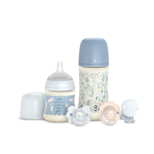 Suavinex, Coffret Cadeau Nouveau-né avec Biberons Anti-coliques 150 ml Débit Lent + 270 ml Débit Moyen + 2 Sucettes 0/6 Mois avec Téterelle Physiologique SX Pro + Attache-sucette. Wonderland Bleu