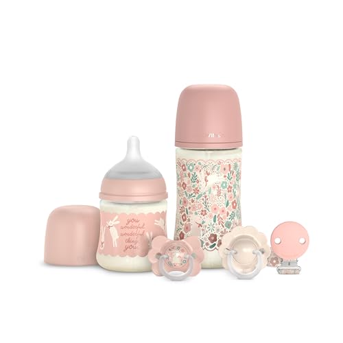 Suavinex, Coffret Cadeau Nouveau-né avec Biberons Anti-coliques 150 ml Débit Lent + 270 ml Débit Moyen + 2 Sucettes 0/6 Mois avec Téterelle Physiologique SX Pro + Attache-sucette. Wonderland Rosa