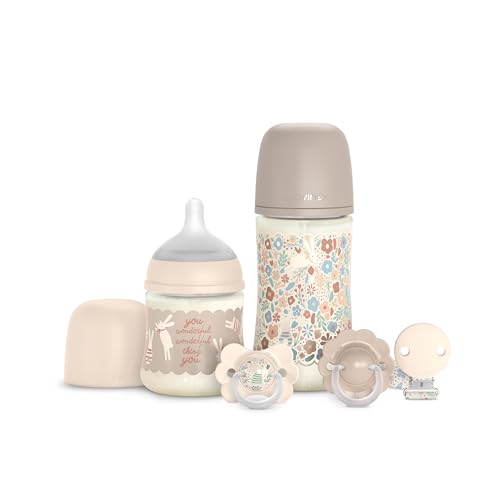 Suavinex, Coffret Cadeau Nouveau-né avec Biberons Anti-coliques 150 ml Débit Lent + 270 ml Débit Moyen + 2 Sucettes 0/6 Mois avec Téterelle Physiologique SX Pro + Attache-sucette. Wonderland Beige
