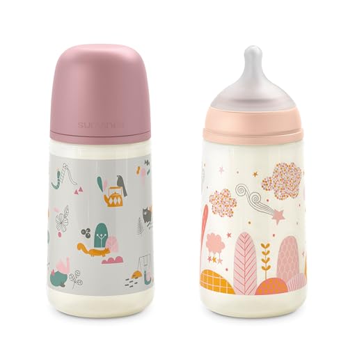 Suavinex, Lot de 2 Biberons 270 ml, Tétine Symétrique SX Pro en Silicone avec Valve Anticolique, Débit Moyen (M), Liquides de Densité Moyenne, Lait, Jus, Eau. Bébés +3 Mois. Birdies, Wild&Free, Rose