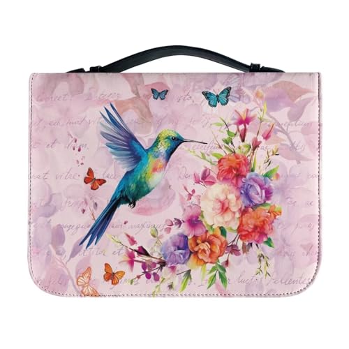 Ceudet Housse de bible en cuir avec imprimé floral et croix pour femme avec poignées et drapeau français, étui de transport étanche noir, sac fourre-tout, Fleurs Papillon Colibri - Rose, xx-large