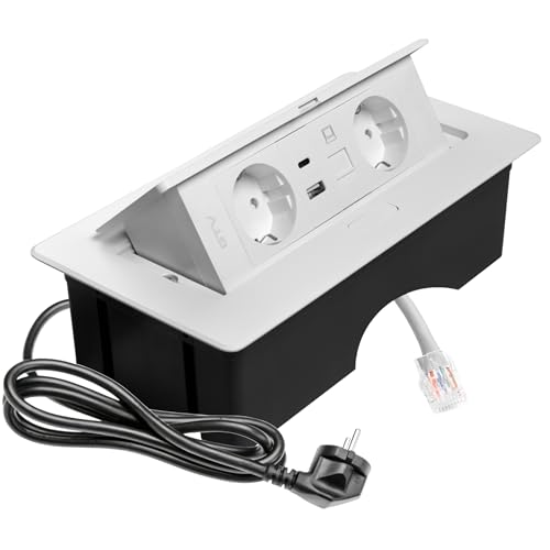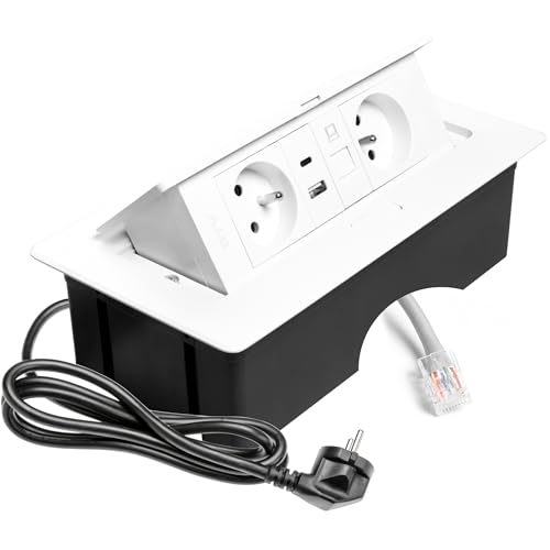 GTV Prise encastrable Multisoft blanche avec 2 prises de courant avec terre, USB A+C, RJ45, escamotable avec couvercle, câble de 1,5 m, pour cuisine, bureau, table de conférence et de travail