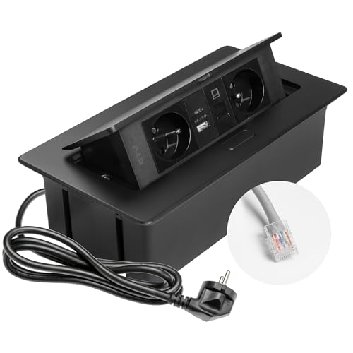 GTV Prise encastrable Multisoft noire avec 2 prises de courant avec terre, USB A+C, RJ45, escamotable avec couvercle, câble de 1,5 m, pour cuisine, bureau, table de conférence et de travail
