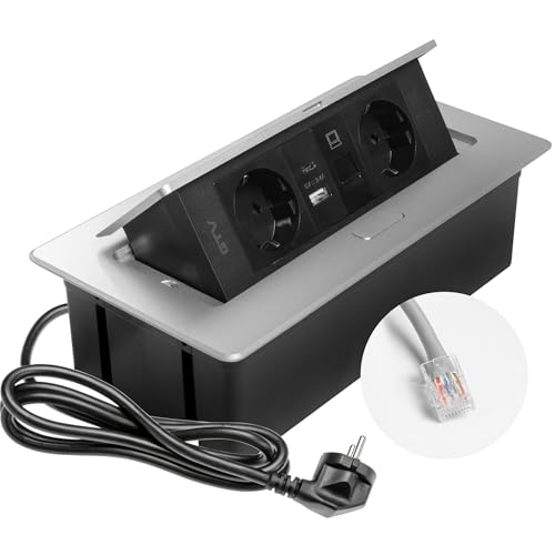 GTV Prise encastrable Multisoft en aluminium avec 2 prises de courant avec terre, USB A+C, RJ45, escamotable avec couvercle, câble de 1,5 m, pour cuisine, bureau, table de conférence et de travail