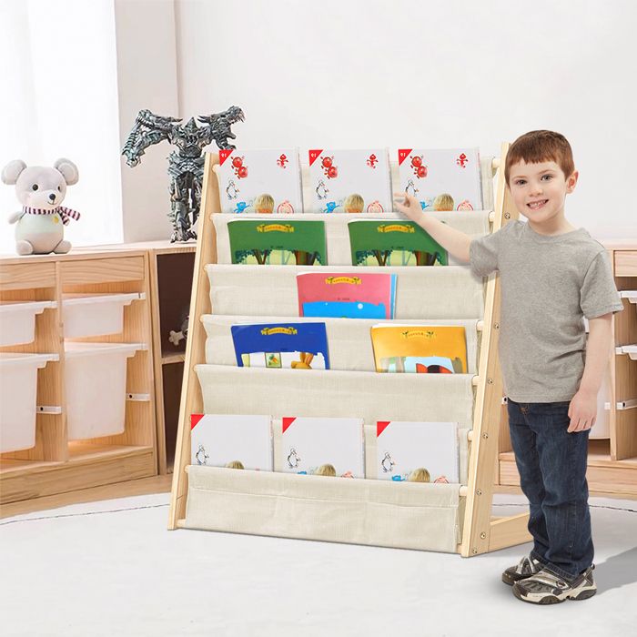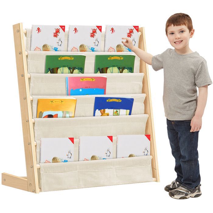SoBuy Bibliothèque Enfant Meuble Rangement Jouet et Livres pour Chambre Enfant Étagère à Livre avec 4 Compartiments et 3 Poches Tissu Naturel 63x28x76cm KMB50-N