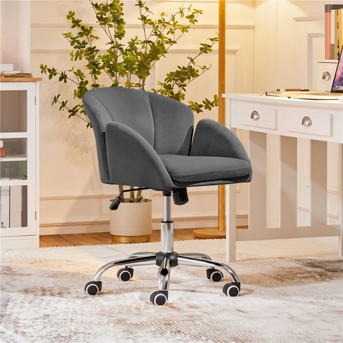 Chaise de bureau en velours fauteuil de bureau design coquillage avec dossier inclinable capitonné chaise d'ordinateur à roulettes réglable en hauteur pour chambre salon bibliothèque gris clair