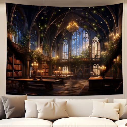 QGHOT Tapisserie médiévale pour bibliothèque, vintage, gothique, bibliothèque, toile de fond effrayante, tenture murale, art mural pour chambre à coucher, salon, grand bureau, zoom 78,7 x 104 cm (L x