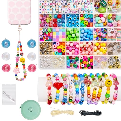 HolidayQbee Kit DIY Bracelets et Porte-clés Téléphone - Billes de Formes Diverses (Sourire, Cœur, Lettres) - Set Complet avec Accessoires de Création