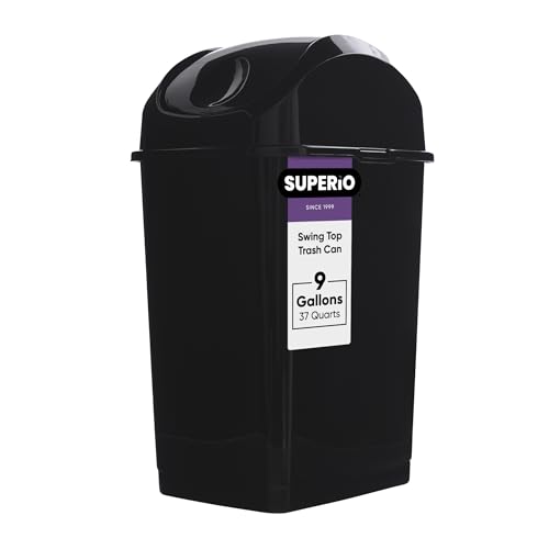 Superio Kitchen Trash Can with Swing Top Lid 9 Gallon Slim Waste Bin 37 Qt Sturdy Plastic Garbage Can Medium Recycling Bin for Office, Bathroom, Under Counter, Dorm, Bedroom (Black)