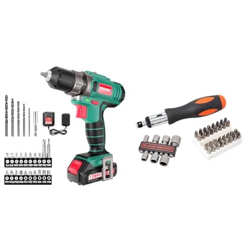 HYCHIKA 12V Visseuse Devisseuse Sans Fil avec Batteries, 30Nm Perceuse Visseuse & Black & Decker A7062-XJ Kit de Tournevis à cliquet avec accessoires Noir
