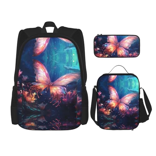 WZYCWB Magic Butterfly Campus Life Ensemble sac à dos (3 pièces) – Sac d'école + trousse à crayons + sac à déjeuner pour répondre à tous les besoins quotidiens des étudiants. Noir, taille unique, noir