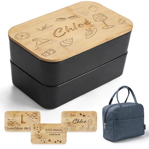 KDO MAGIC - Lunch box personnalisable - Gravez votre prénom - Bento deux étages - Boite à repas gravée - Boite à goûter personnalisée - Couverts offert - Cadeau fête des pères (Noir, Modèle Femme)