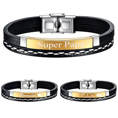 KDO MAGIC - Bracelet personnalisé en cuir tressé noir - Personnalisable avec un prénom ou texte gravé - Bijoux gravé - Cadeau fête des pères, papa