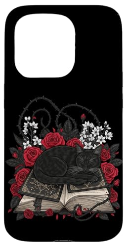 Chat Noir endormi sur sorcières Grimoire avec des épines de Roses Coque pour iPhone 15 Pro