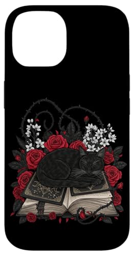 Chat Noir endormi sur sorcières Grimoire avec des épines de Roses Coque pour iPhone 14