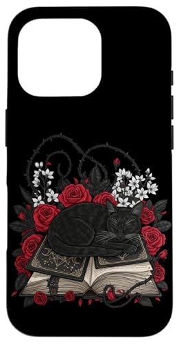 Chat Noir endormi sur sorcières Grimoire avec des épines de Roses Coque pour iPhone 16 Pro