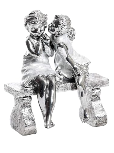 DRW Figurine d'enfants sur Un Banc Blanc nacré et argenté 19 x 11,5 x 22,5 cm