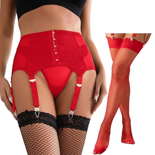 ohyeahlady Porte Jarretelle Femme Sexy Ensemble Avec Bas Grande Taille Porte Jarretelle Dentelle Taille Haut Pince Bas Resille Autofixant Guepiere Collant Tenu Hot Ensemble Lingerie Hot M-L,Rouge