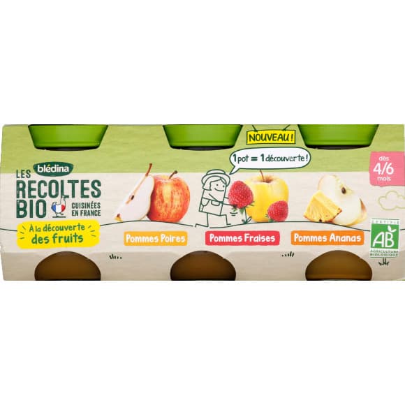Bledina les recoltes bio pots pommes poires / pommes fraises / pommes ananas 3x130g dès 4/6 mois