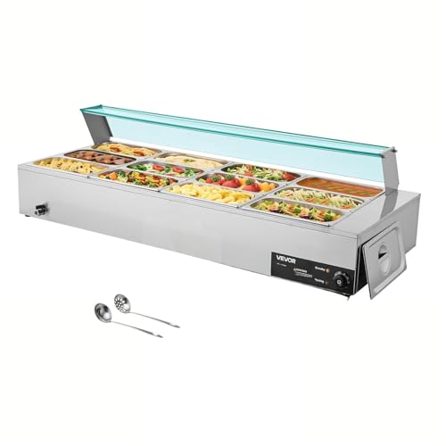 VEVOR Chauffe-Plat Électrique à Vapeur 1700 W, Buffet Chauffant en INOX, Bain-Marie avec 12 Bacs de 1/3, Couvercle en Verre et Louches à Soupe et Perforées, pour Servir Buffet en Libre-Service