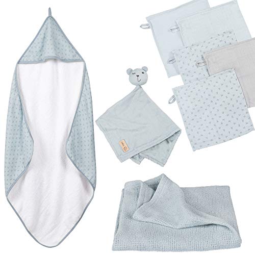 roba Coffret Sortie de Bain Bébé Lil Planet - 1 Cape de Bain + 5 Gants de Toilette + 1 Serviette Doudou + 1 Couverture - Certifié GOTS et OEKO-TEX - Bleu Clair