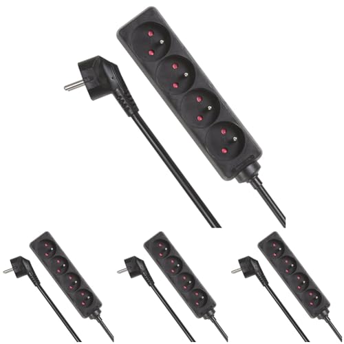 Perel Multiprise 4 Prises, Bloc multiprise parafoudre, 4 Prises électrique française Type E Mise à la Terre française, câble de 1.5, 3G1.5, Usage intérieur, Noir (Lot de 4)