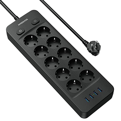 NVEESHOX Multiprise Electrique (16A/4000W), Multiprise 10 Prises avec 4 Ports USB, Bloc Multiprise Parafoudre et Surtension avec Interrupteur, Câble 5Mpour Maison Bureau,Noir