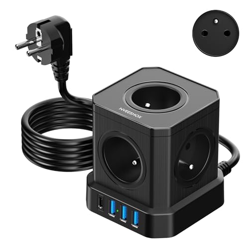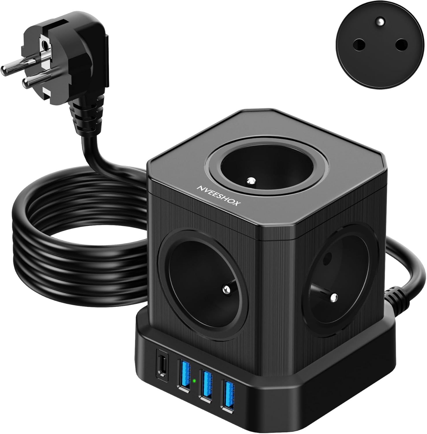 NVEESHOX Cube Multiprise (16A/4000W) 5 Prises françaises avec 3 Ports USB et 1 Port Type-C, Bloc Multiprise Parafoudre et Surtension avec Interrupteur, Câble 2Mpour Maison Bureau,Voyage (Noir)