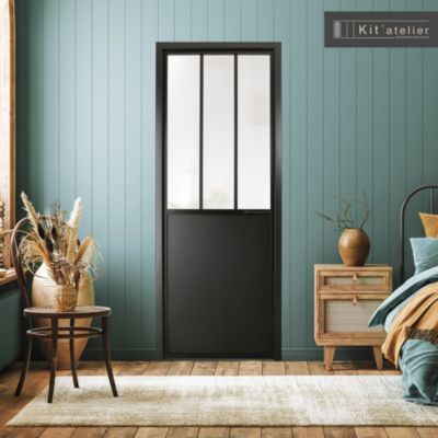 Bloc-porte atelier 3 carreaux vitrés transparent, poussant droit, coloris noir mat H.213 x l.73cm