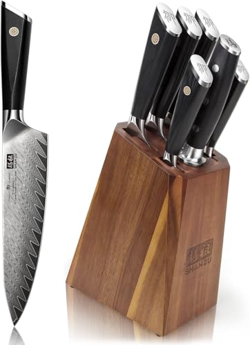 SHAN ZU Ensemble de Couteaux de Cuisine Damas, Set de 5 pièces Professionnels pour Chef, Acier Damas Japonais 10Cr15MoV avec Bloc de Couteaux à Manche G10