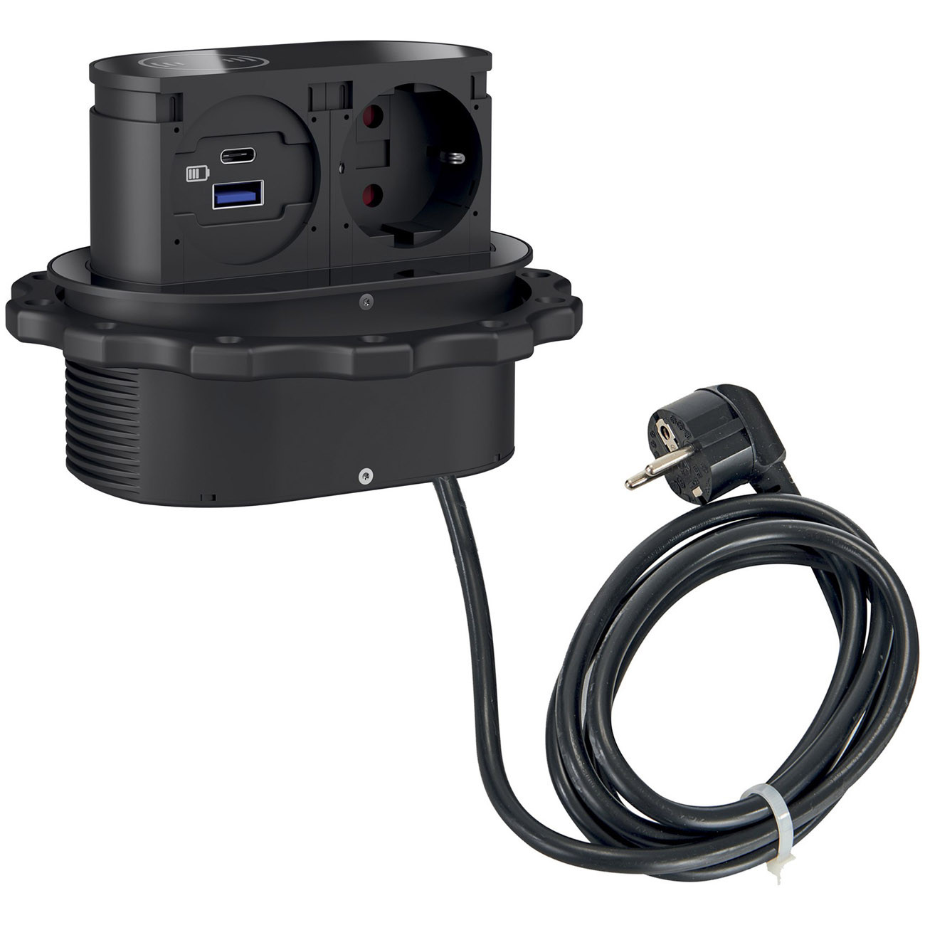 Electraline 35446 Bloc Multiprise escamotable Plan de Travail avec 3 16A Norme française + 2 3.1A A + 1 USB Type C 15.5W, Prise Encastrable pour Cuisine, Diamètre 120mm, 2M, Noir, Vertical