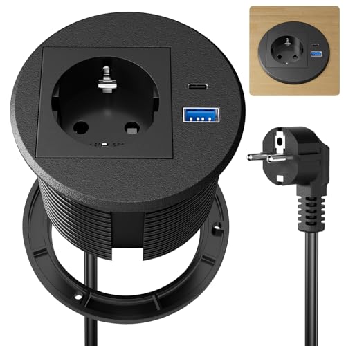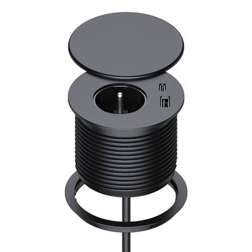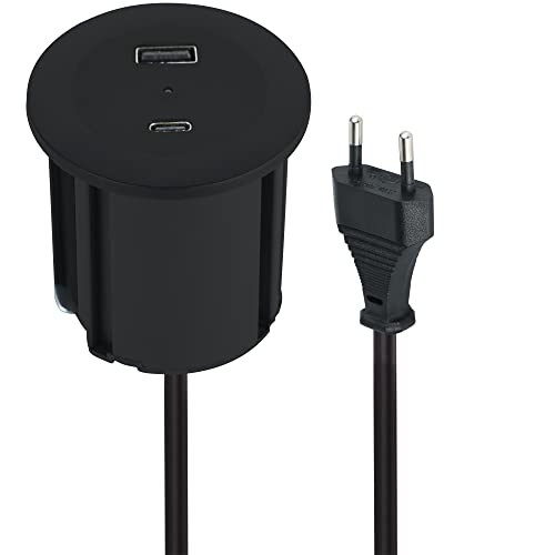 Bloc Prise Encastrable, Dinolink Multiprise Encastrable avec 1 Prise, 1 Port USB C, 1 Port USB A, 80 mm de Diamètre, 1,5M de Câble, Prise Bureau pour la Cuisine, Le Bureau, Les Meubles, Noir