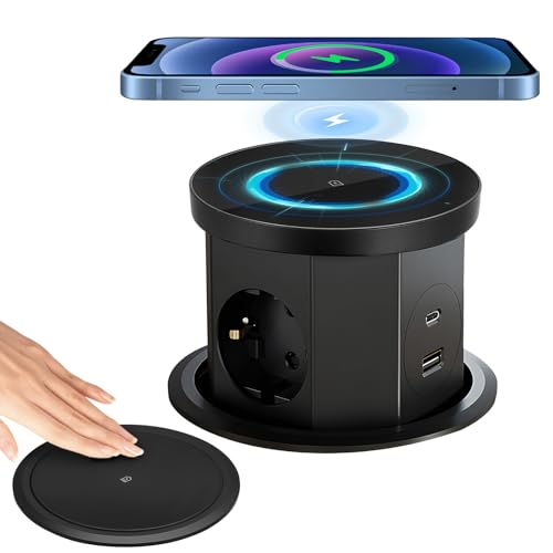 Neulriscn Bloc Prise Encastrable Plan de Travail Multiprise Encastrable, Prise de Table Escamotable 3 Prises avec 1 USB C 1 USB A - Prise de Table Rétractable - avec Chargeur sans Fil (Noir)