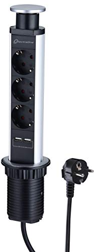 Electraline 62557 Bloc Multiprise Escamotable 3 2 USB, diamètre Standard 60mm, Prise encastrable pour Cuisine, Bureau, Noir
