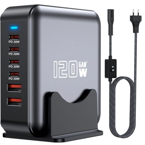 Bloc de Chargeur Rapide USB C, Adaptateur de hub GaN de Station de Charge à 6 Ports 120W, Prise de Bande d'alimentation Multi-Chargeur Mural USB C pour iPad iPhone 16 15 14 13 12 Pro Max Galaxy S23