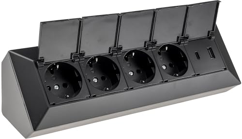 ChiliTec Bloc multiprise 4 prises avec couvercle rabattable USB-A USB-C PD 230 V pour cuisine, bureau, atelier, noir