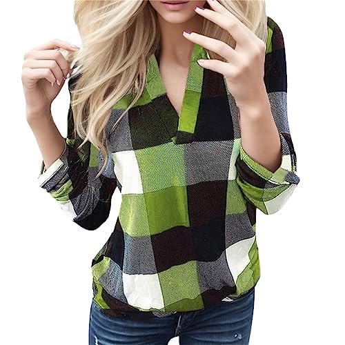 Blouse Femme Chic Ete - Chemisiers Femmes, Chemise À Carreaux À Manches Longues en Coton Décontracté (Green S)