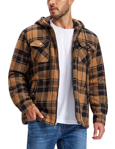 MoFiz Homme Veste Chemise Flanelle à Carreaux Doublée Chaude Blouson d'hiver Coton Chemise de Bûcheron Travail Manches Longues avec Capuche et Cinq Poches Marron Noir EU XXL