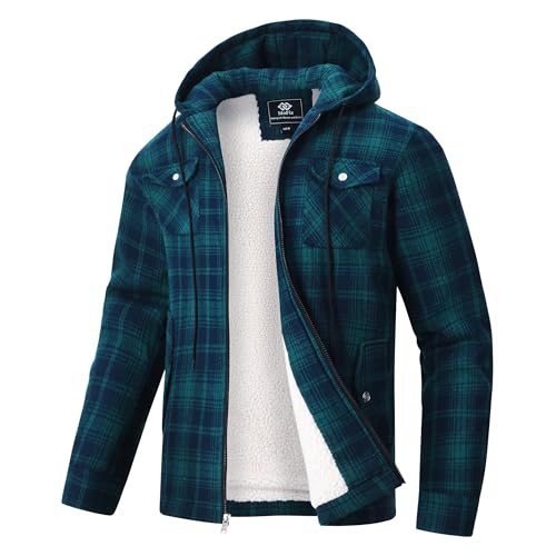 MoFiz Homme Veste Chemise Flanelle à Carreaux Doublée Chaude Blouson d'hiver Coton Chemise de Bûcheron Travail Manches Longues avec Capuche et Cinq Poches Vert Bleu EU XL