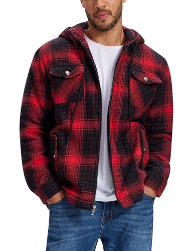MoFiz Homme Veste Chemise Flanelle à Carreaux Doublée Chaude Blouson d'hiver Coton Chemise de Bûcheron Travail Manches Longues avec Capuche et Cinq Poches Rouge Noir EU L