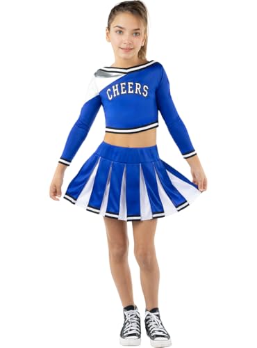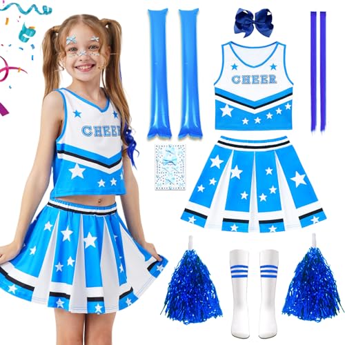 Déguisement Pompom Girl, Fille Costume Cheerleader, Deguisement Pompom Girl, Costume Cheerleader Enfant avec tenue de pom-pom girl avec Pompoms, Bâtons Joie, Chaussettes pour Carnaval (Bleu, 150)