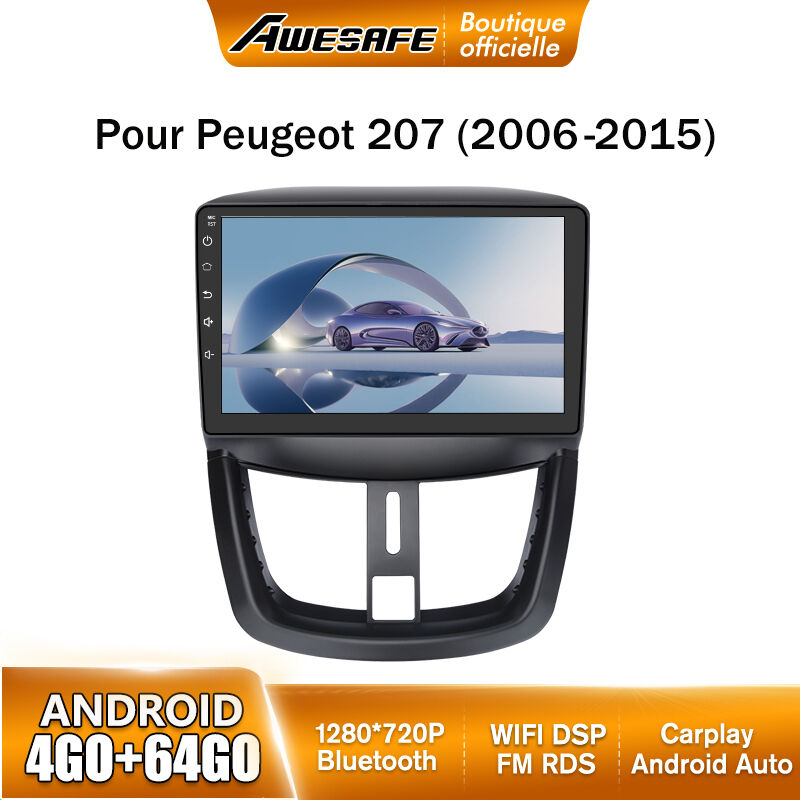 AWESAFE Autoradio Android 13 [4Go+64Go] pour Peugeot 207 (2006–2015) – Écran 9" HD, CarPlay sans Fil, Android Auto, GPS, 4G, WiFi, Bluetooth, DSP, MirrorLink, FM/AM/RDS, USB, Commandes Volant