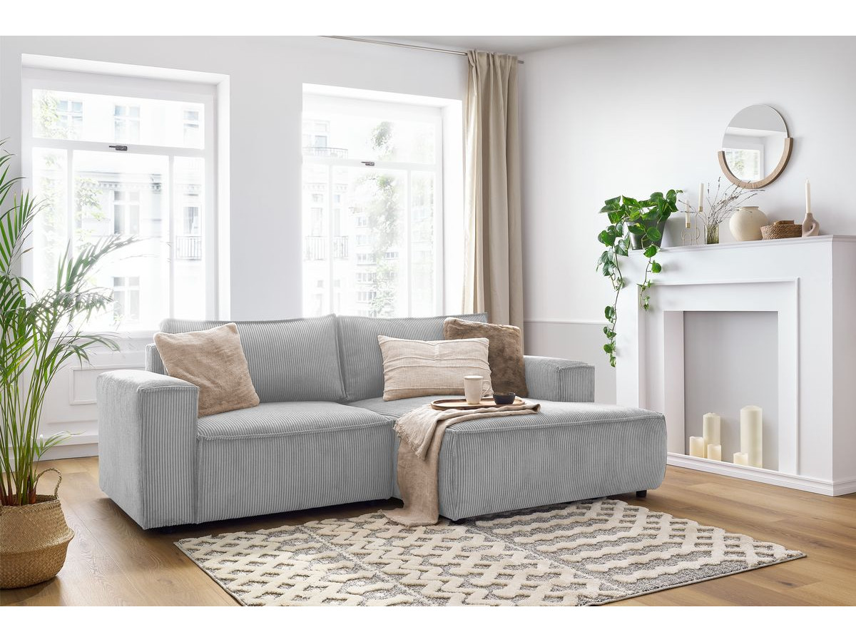 Canapé d'angle fixe compact NIHAD velours côtelé gris clair angle droit BOBOCHIC 3 places